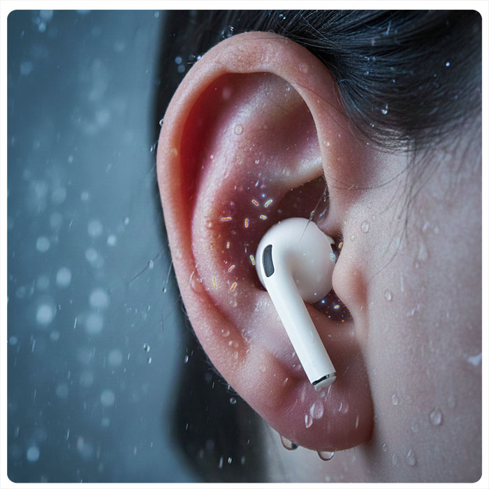 귓속에 땀이나 물기가 남아있는 상태에서 이어폰으로 귀를 막으면 습도가 높아져 곰팡이나 세균이 번식하기 딱 좋은 환경이 됩니다.