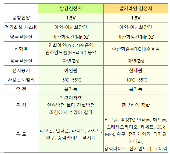 이러한 차이 때문에 망간건전지는 전압이 크게 필요하지 않고 저전력으로 오래 사용할 수 있는 제품에 사용합니다.