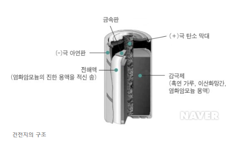 >>망 간 : 이산화망간을 양극 작용물질, 아연을 음극 작용 물질, 염화암모늄