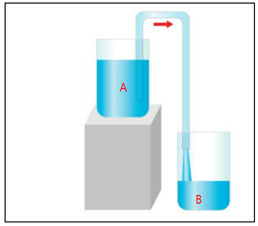 높은 곳에 올려놓은 A수조의 액체 표면에 대기압이 작용하여 누름으로써 짧은 관 속에 있는 액체를 위로 끌어올리게 됩니다. 그러면 액체는 관 꼭대기에서 밀려 중력 때문에 낮은 B 쪽의 수조 떨어지게 됩니다.