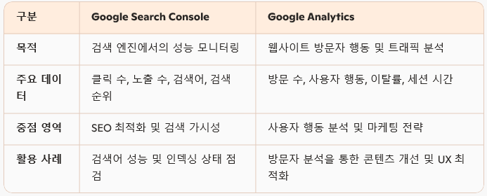 Google Search Console은 **검색 엔진 최적화(SEO)**에 초점을 맞추고 있으며, 웹사이트가 Google 검색에서 어떻게 노출되는지를 분석하는 데 유용합니다. 반면, Google Analytics는 방문자의 행동을 분석하여 웹사이트의 사용자 경험(UX)과 마케팅 성과를 평가하는 데 중점을 둡니다.