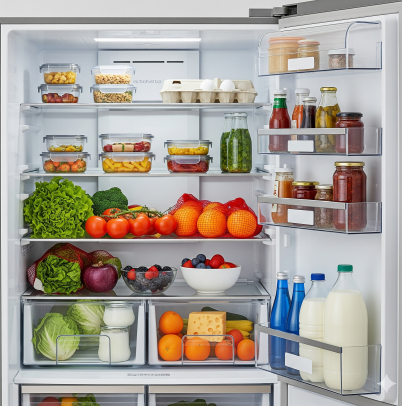 - 가장 위쪽 선반: 냉장고 상단은 온도가 가장 안정적인 곳 중 하나입니다. 남은 음식, 반찬, 요거트, 치즈 등 자주 먹는 식품을 보관하기 좋습니다.
