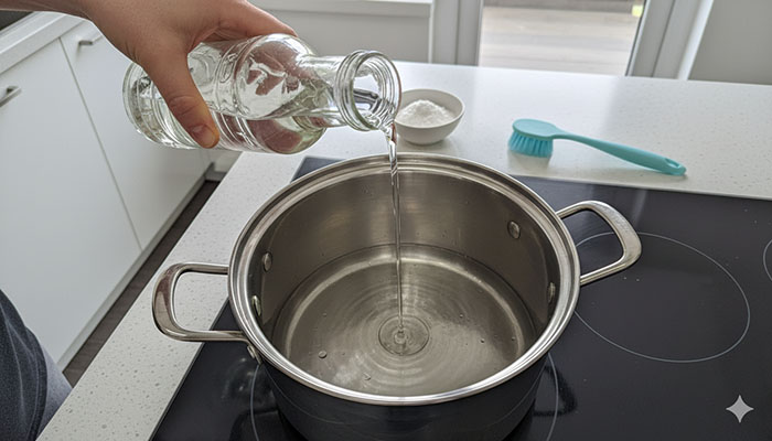 - 식초 + 물 끓이기: 냄비에 물과 식초를 1:1로 넣고 10분간 끓인 후 부드러운 수세미로 닦습니다.