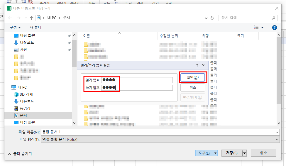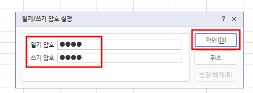 【 "열기/쓰기 암호 입력"후 확인을 누릅니다.】