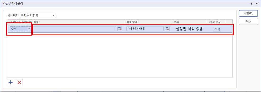 조건부 서식 대화상자가 뜨면 아랫부분의 +를 누르면 설정값 입력칸이 생성됩니다.