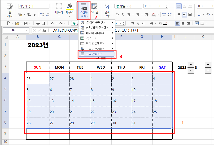 월을 표시하는 K3값과 같지 않아야 하기때문에 =MONTH(B4)<>게 입력 해준후 월에 해당하는 셀인 K3셀을
