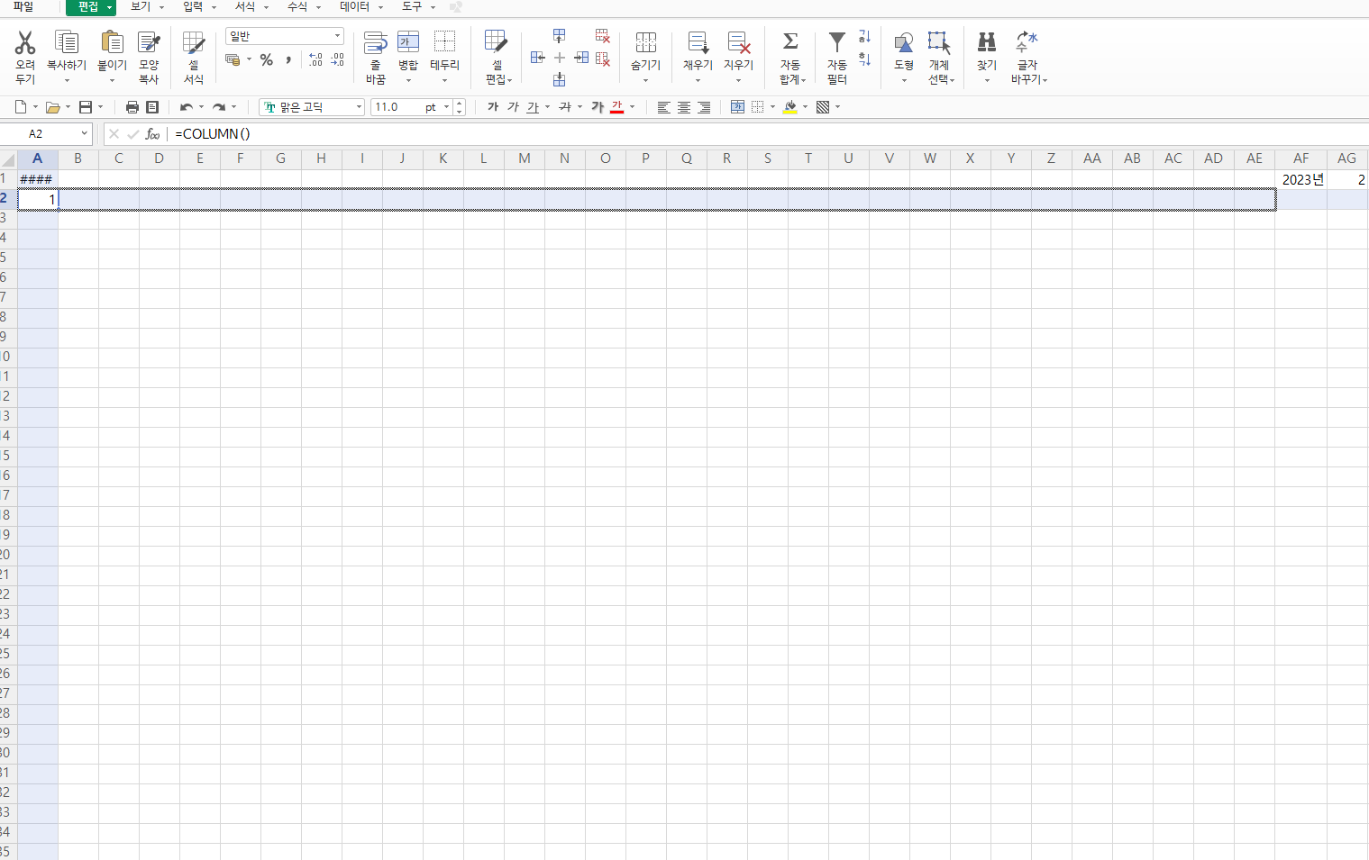 A2열에서 AE2열 까지 선택한 후