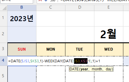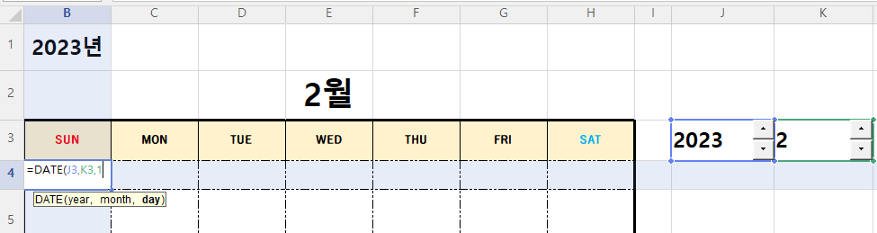 =DATE(가 보이면 J3셀(년도)을 선택해줍니다.
