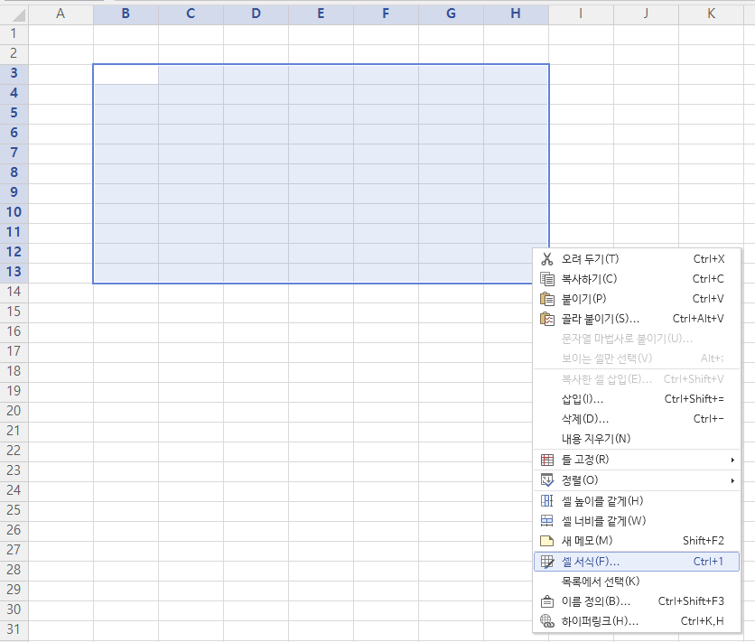B4에서 H4까지 선택후 셀서식을 선택합니다.