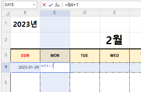 그다음 일요일인 B6은 B4보다 7일이 지난 후이니 =B4+7 을 입력해줍니다.