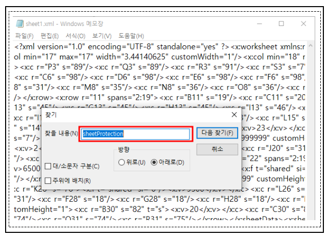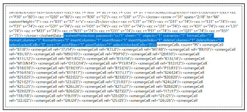 <x:sheetProtection 부분의 <가 열린 부분부터 selectUnlockedCells="0"/>의 >가