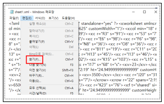 그 폴더 안의 sheet1.xml파일을 메모장에서 열어줍니다.
