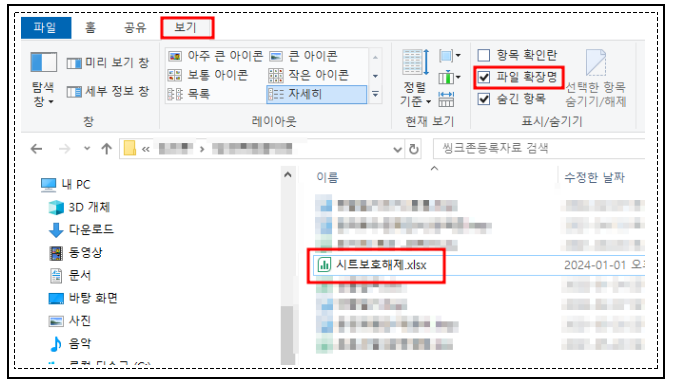 윈도우 탐색창의 보기에서 파일 확장명이 보이도록 체크합니다.