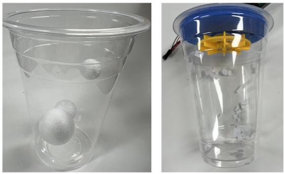 모터, 프로펠러, 원형 EVA판, 스티로폼공 3개, 건전지, 건전지케이스, 투명컵