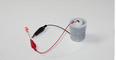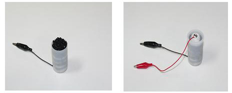 숯 건전지는 알루미늄 호일이 (-) 극, 숯이 (+) 극으로 작용하는 일종의 화학건전지입니다.