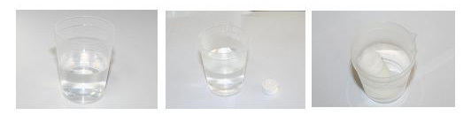 3) 소변컵에 물을 넣은 후 소금을 넣고 불포화용액을 만든 후 압축티슈를 넣습니다.