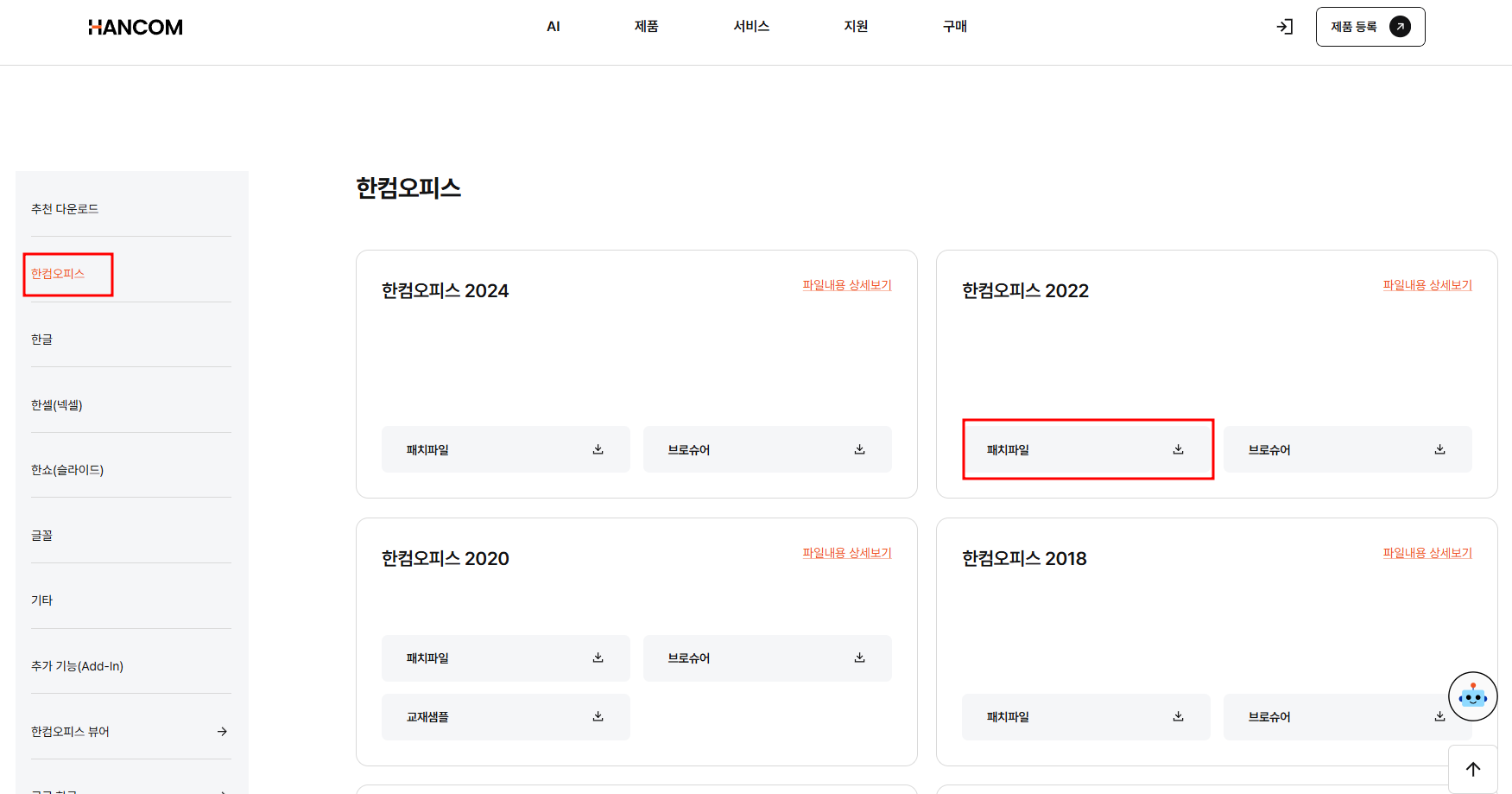 왼쪽 메뉴에서 한컴오피스를 선택한 후