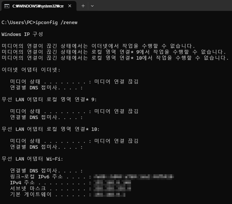 → ipconfig /renew 명령어를 입력하면 공유기로부터 새 IP를 받아 다시 연결을 시도합니다.