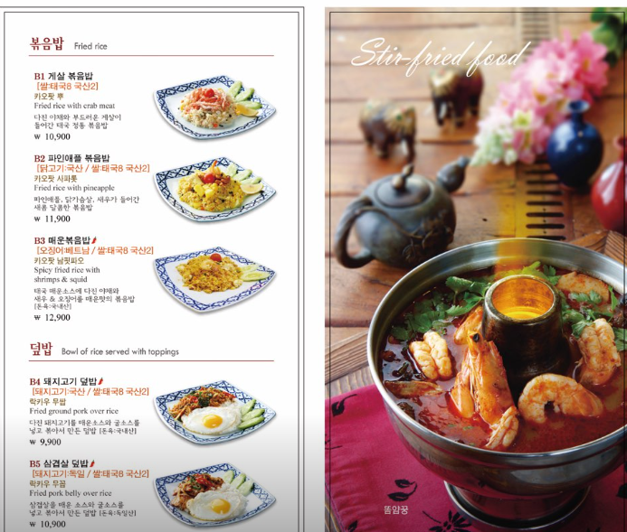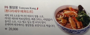 첫 번째는 똠양꿍.. 위의 사진처럼 저리 나올지 알았는데 아래 메뉴판처럼 신선로에 닮 겨져 나왔다.