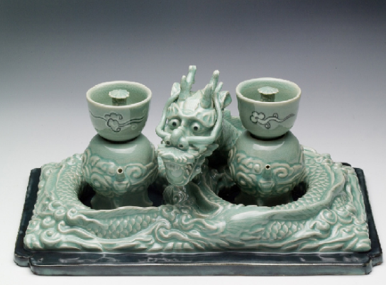 백자귀룡 계영배(위 왼쪽), 청자죽 계영배(위 오른쪽)