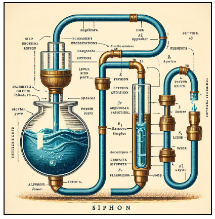 높은 곳에 올려놓은 A수조의 액체 표면에 대기압이 작용하여 누름으로써 짧은 관 속에 있는 액체를 위로 끌어올리게 됩니다. 그러면 액체는 관 꼭대기에서 밀려 중력 때문에 낮은 B 쪽의 수조 떨어지게 됩니다.