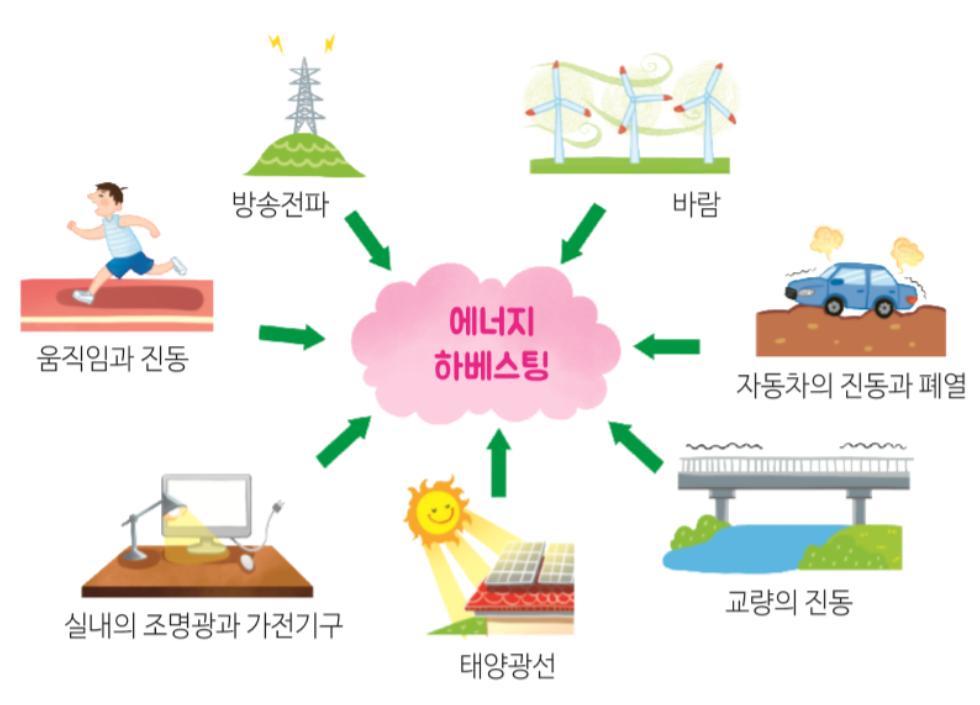 이렇게 일상생활 속에서 버려지는 에너지를 모아 재활용할 수 있도록 하는 기술이 에너지 하베스팅입니다.