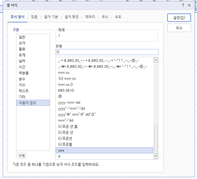 셀서식에서 사용자정의 G/표준을 선택합니다.