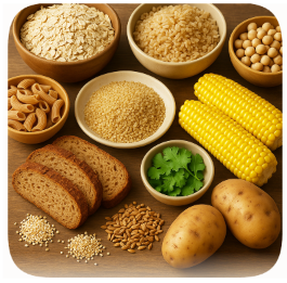 : 현미, 귀리, 통밀빵, 고구마, 콩류, 퀴노아, 렌틸콩, 채소류 등