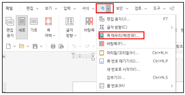 하위 메뉴에서 ‘쪽 테두리/배경’을 클릭하면