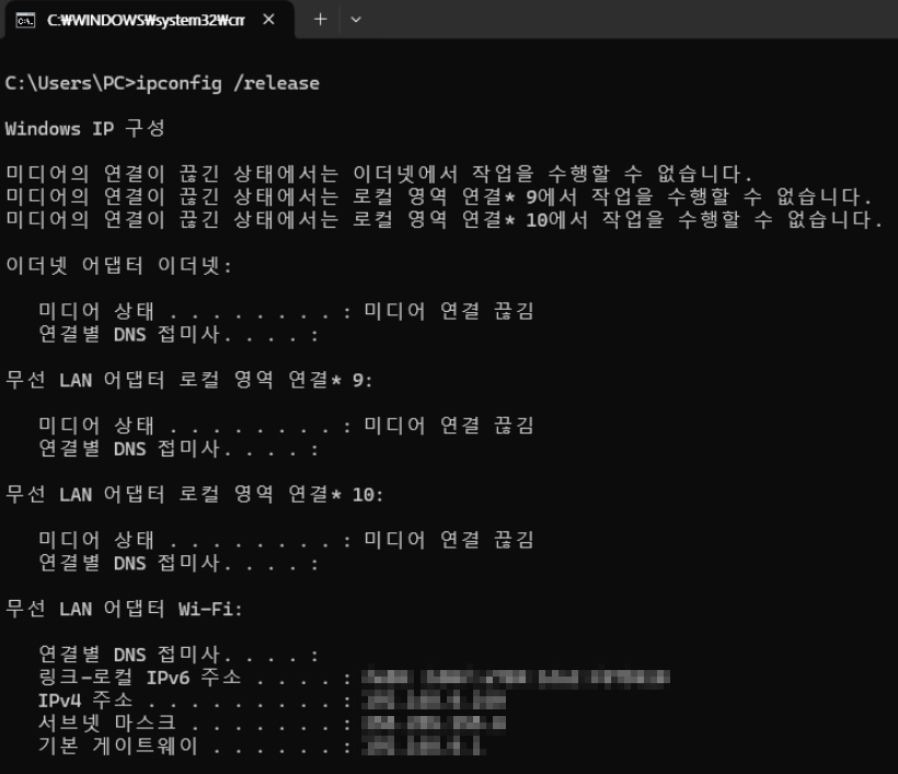 - ipconfig /release만 입력하고 renew 안 하면 인터넷이 안 됩니다