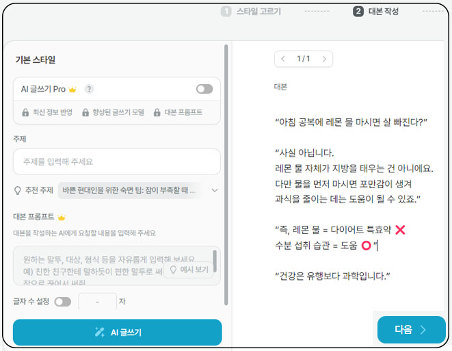 복사해 둔 대본을 넣고 [다음]을 누릅니다. 그러면 AI가 대본에 어울리는 성우 목소리와 배경 영상(이미지)을 자동으로 골라줍니다.