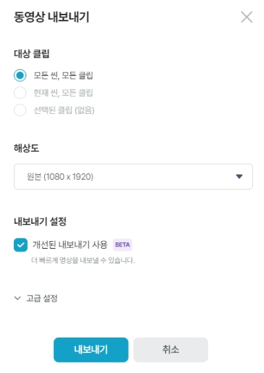 오른쪽 상단 [내보내기] → [영상 파일] → [내보내기]를 누르면 끝! 이제 내 컴퓨터에 저장된 영상을 유튜브에 올리기만 하면 됩니다.